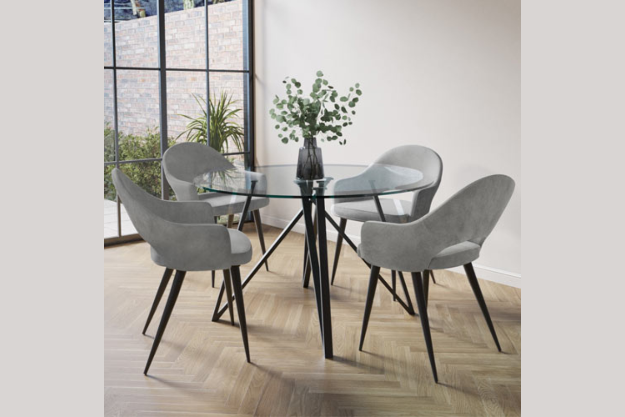 Rectangle Glass Dining Table with 4 Mink Velvet Dining Chairs – Dax