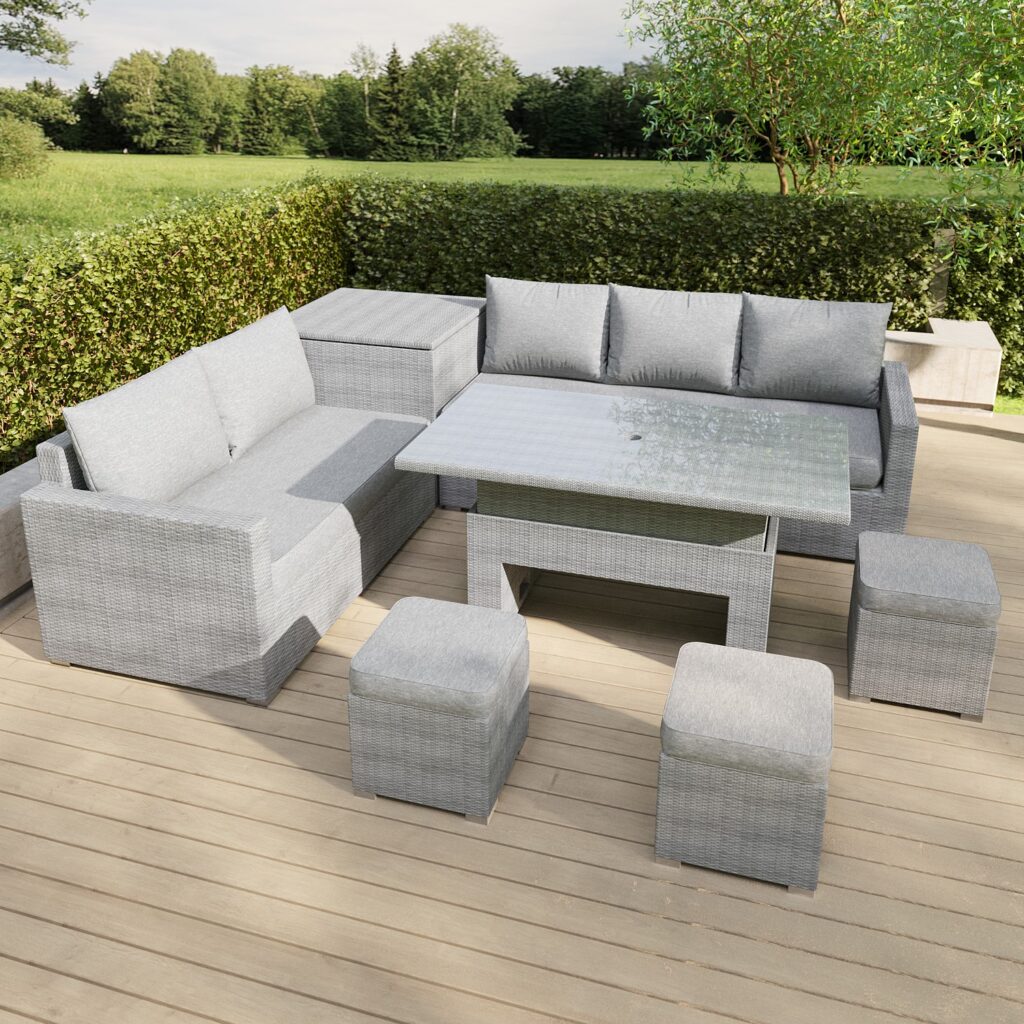 8 Seater Grey Rattan Garden Corner Dining Sofa Set with Height Adjustable Table – Fortrose