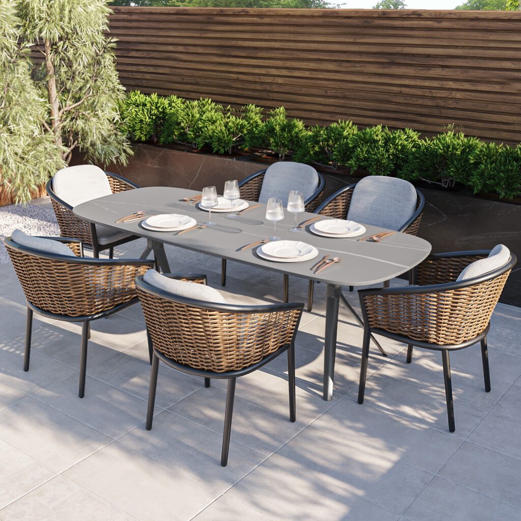 6 Seater Garden Dining Set with Woven Wicker Chairs & Stone Table Top