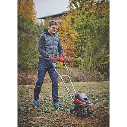 Cordless tiller for loosening up soil in small to medium-sized front and back gardens. Features 4 robust cultivator blades, offering a working width of 300mm and a depth of up to 200mm. Ergonomic folding long handle and height-adjustable transport wheels provide comfortable operation. Also features 2-point safety switch. Requires 2 x 18V Einhell Power X-Change rechargeable batteries (sold separately).