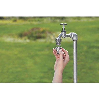 Tap connector ensures a secure garden hose connection and inner design creates maximum water flow. Concentrated water jet, which allows splash-free filling, even when the hose is disconnected. Frost protected. Made in Germany.