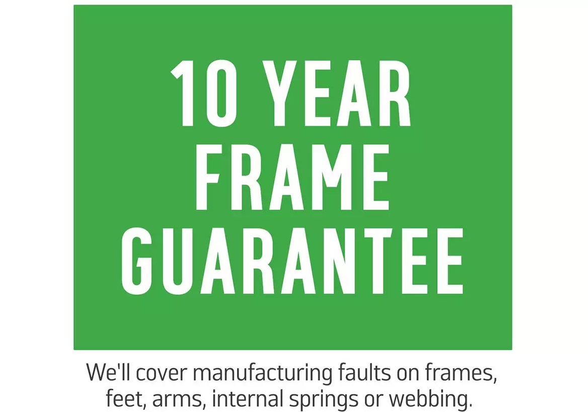 This sofa comes with a 10 year frame guarantee. We’ll cover manufacturing faults on frames, feet, arms, internal springs or webbing. We can arrange a repair, replacement, exchange or refund.