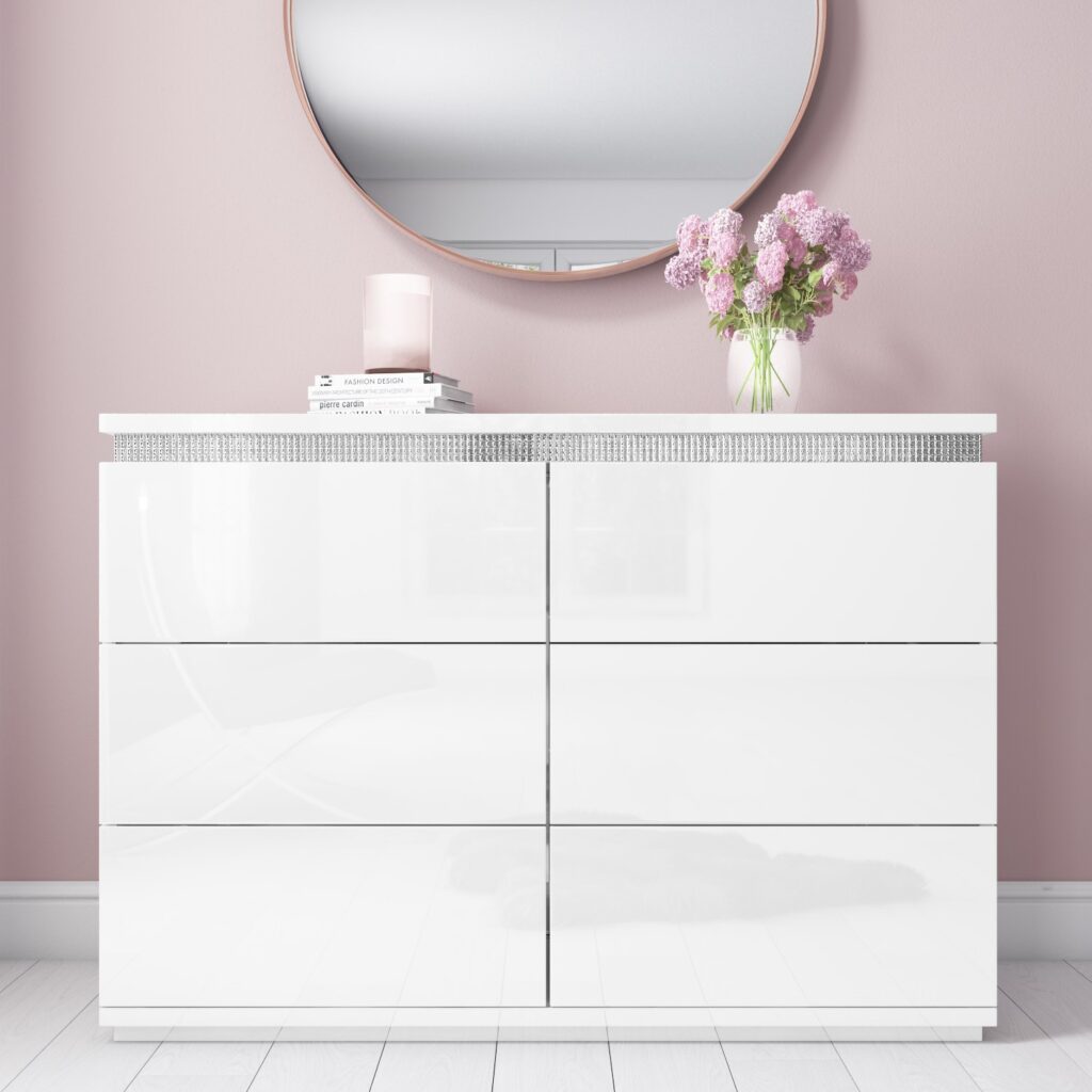 Wide White High Gloss Chest of 6 Drawers with Diamante Trim – Gabriella