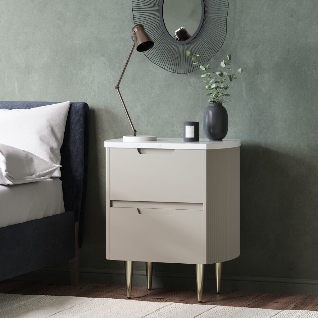 Curved Taupe 2 Drawer Bedside Table with Marble Top – Lorenzo